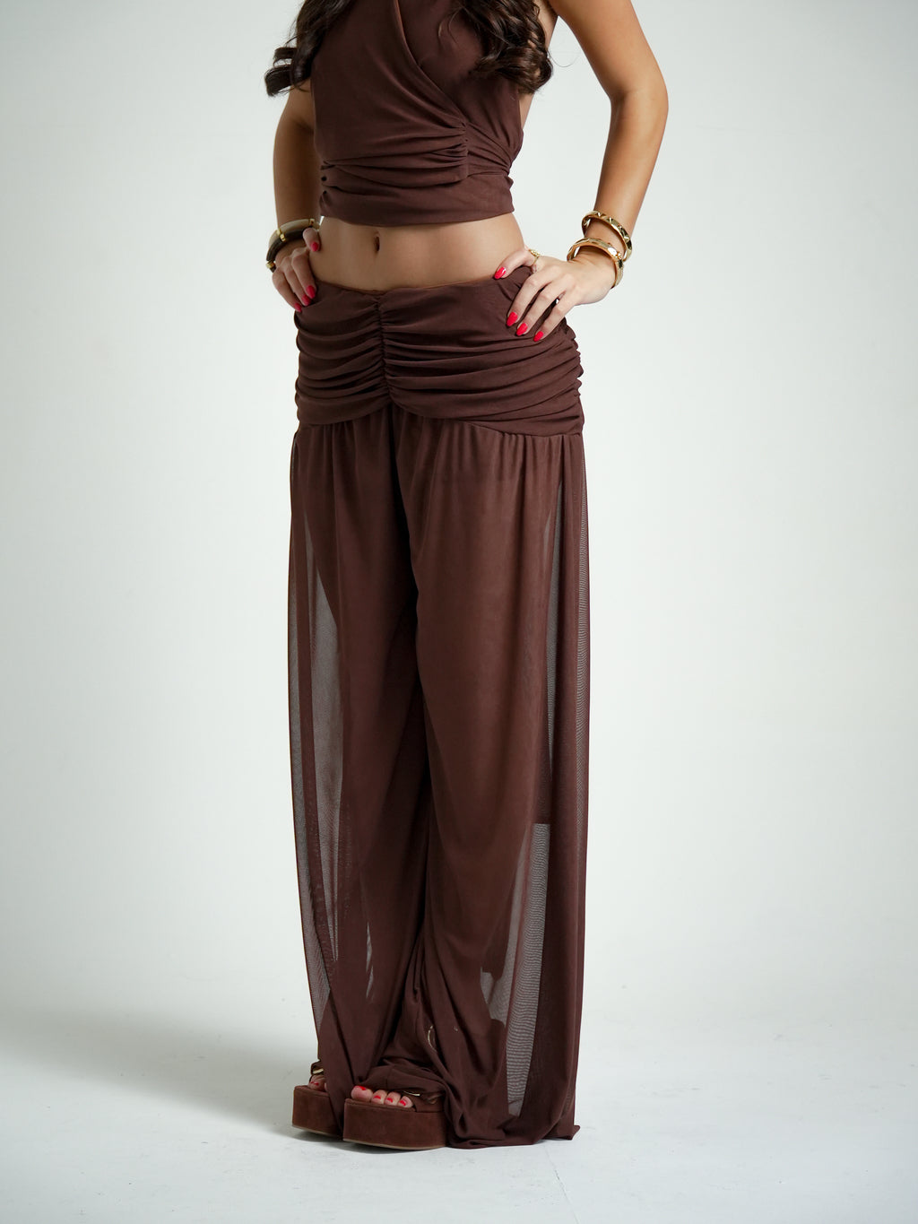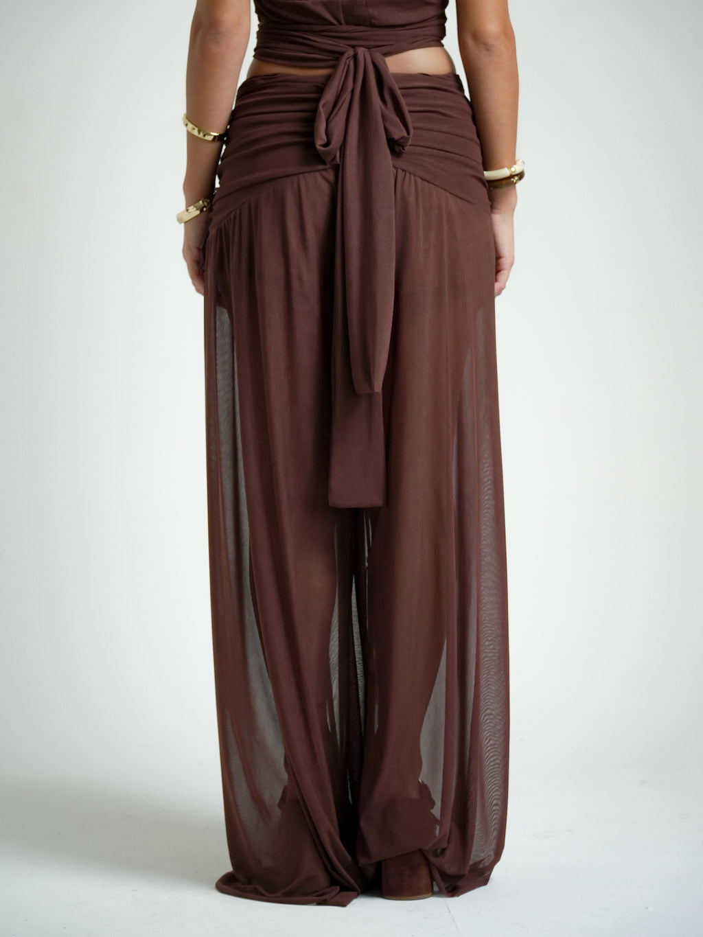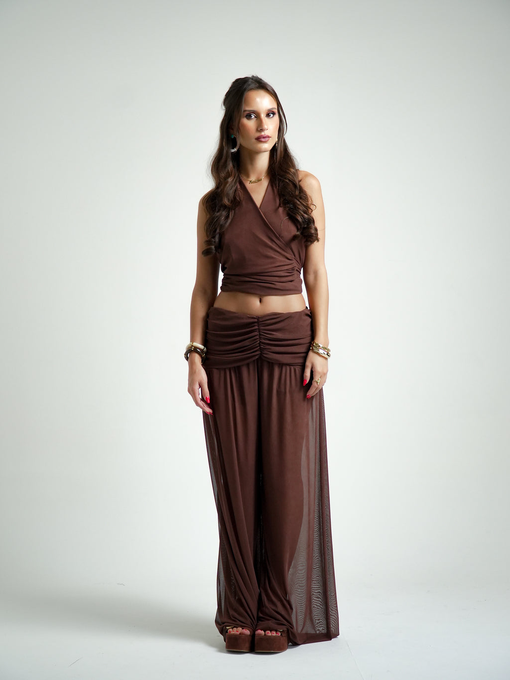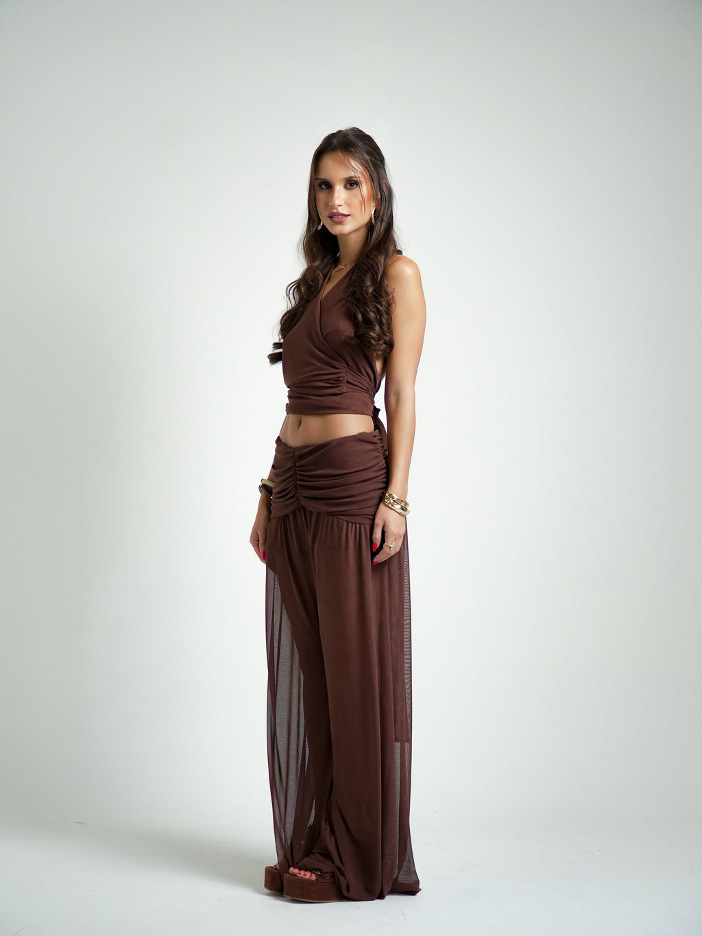 Descubra a Calça Tule, a escolha perfeita para quem deseja ousar com elegância! Com tule totalmente transparente e drapeado na parte superior, ela cria um efeito visual sofisticado e moderno, ideal para compor looks marcantes e fashionistas.