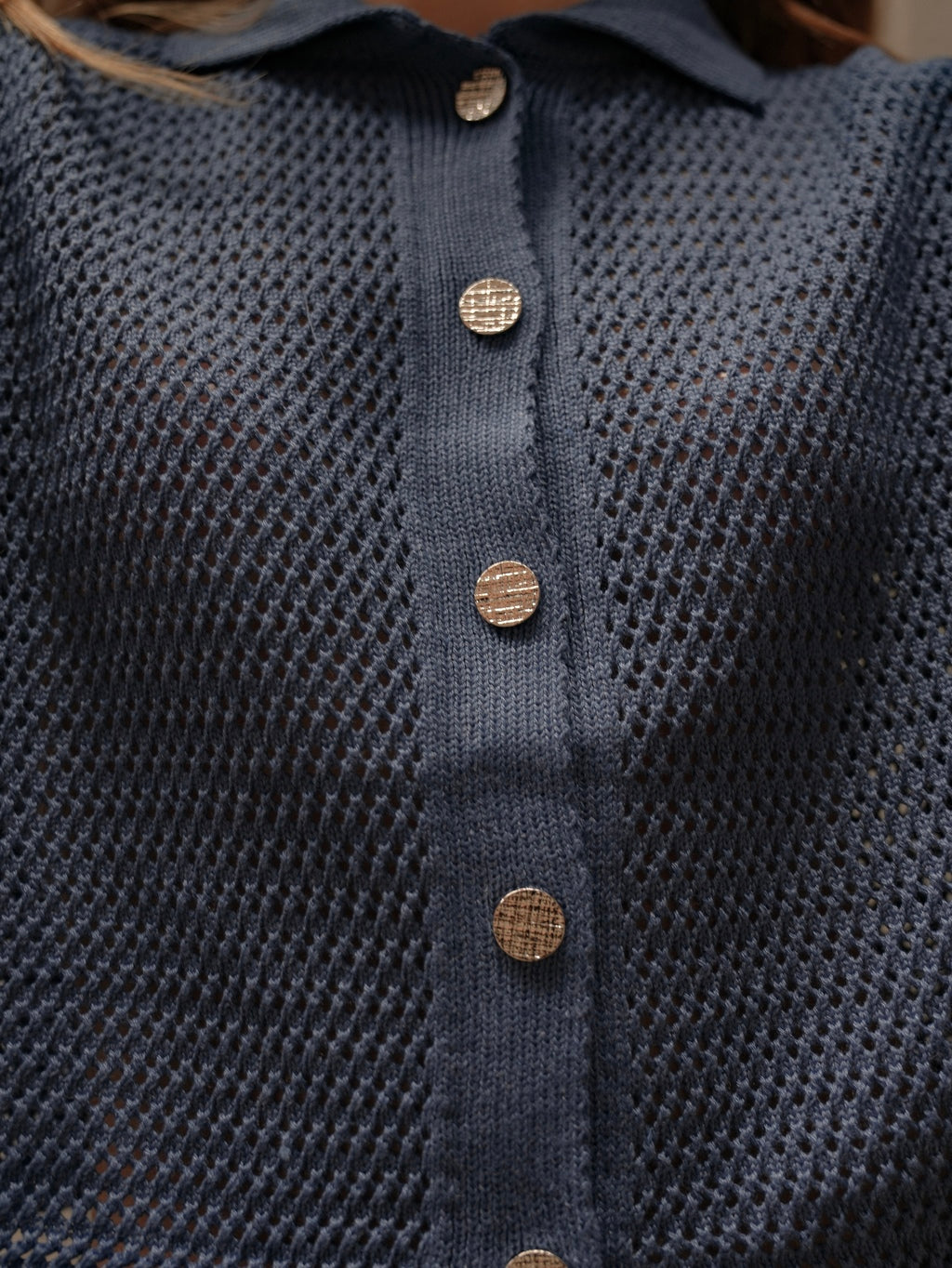 - Gola estilo polo, trazendo um toque clássico e sofisticado.