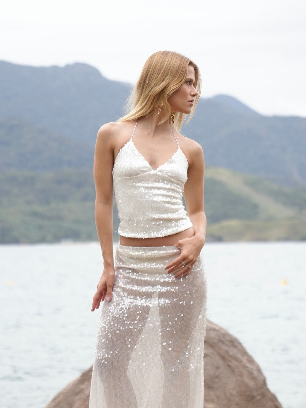 Combine a Saia Longa Paetê Ultra Glow New Year com tops neutros ou bodys para um visual equilibrado e sofisticado. Aposte em acessórios minimalistas para deixar o destaque no brilho da saia.