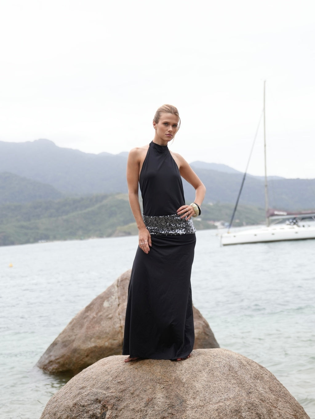 Acompanha uma faixa exclusiva em paetê ultra glow com efeito molhado, adicionando um brilho sofisticado ao visual e tornando a peça ainda mais especial e única. O fecho em botão nas costas, na altura do pescoço, traz delicadeza e facilidade ao vestir.
